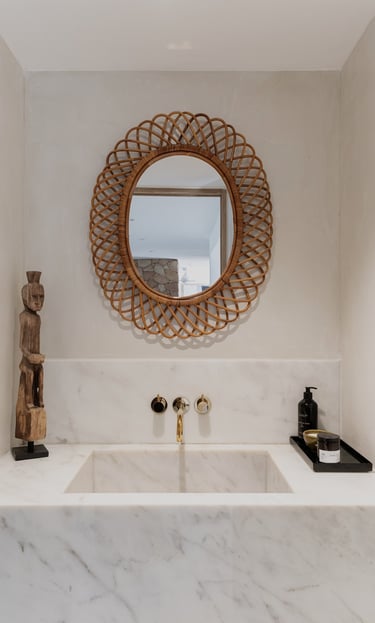 The master suite occupies the entire top floor of the main house with an emperor size bed and large en-suite bathroom that includes a large glass shower and double marble sinks with full mirrored oak cabinets . Adjacent to the bathroom is a large walk-in dressing room with oak wardrobes and drawers with access to a pretty roof terrace. The bedroom also benefits from access to two direct terraces with extensive views, both reachable from ground level.
